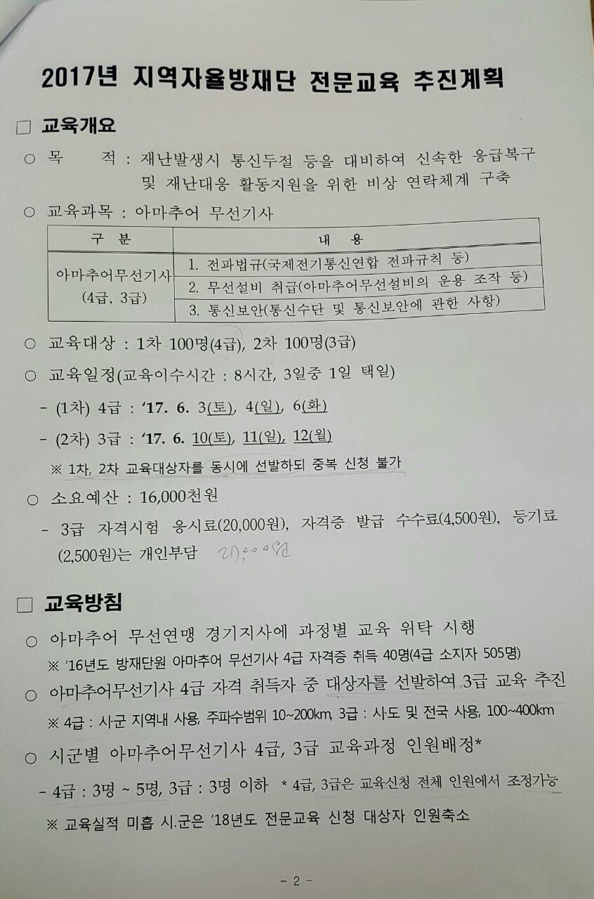경기도청 재난안전과에서 주관하는 자율방재단 전문교육(아무추어 무선사 3급, 4급과정)을 원하시는 단원께서는 신청바랍니다.